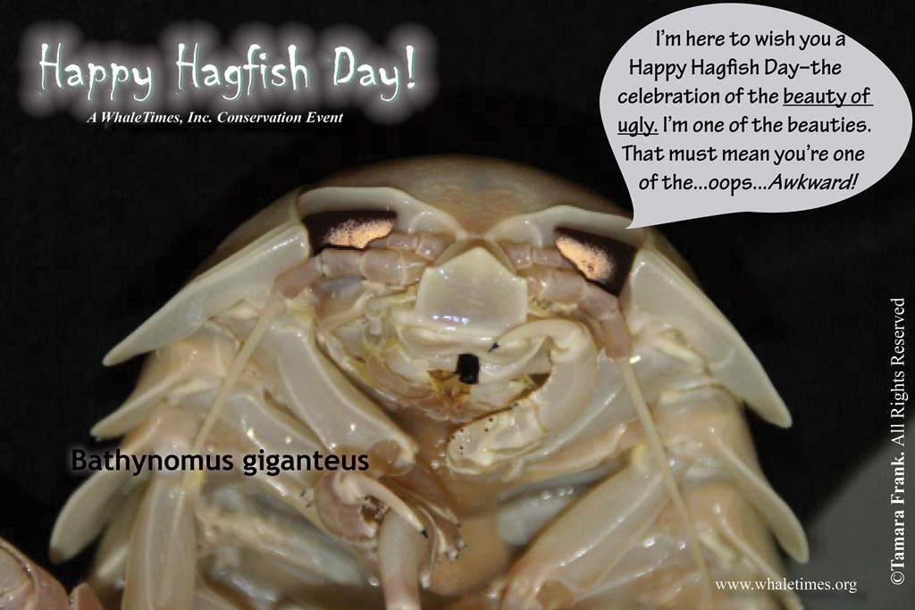 It’s Hagfish Day! Today we celebrate the ‘beauty of ugly’  once again. Sixteen years ago, WhaleTimes created Hagfish Day to raise awareness of all kinds of ocean animals, especially those that are less fortunate in the looks and behavior department. Why? All animals play an important role in their habitat, whether they’re as cute as a dumbo octopus or as slimy as a hagfish.